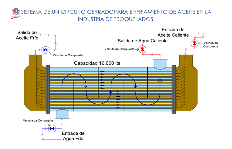 Este sistema se conoce como enfriamiento indirecto. A diferencia de pasar el aceite directamente por el chiller (lo cual podría tapar el equipo con rebabas o virutas metálicas), se utiliza un intercambiador de calor de serpentín dentro de la cisterna.
